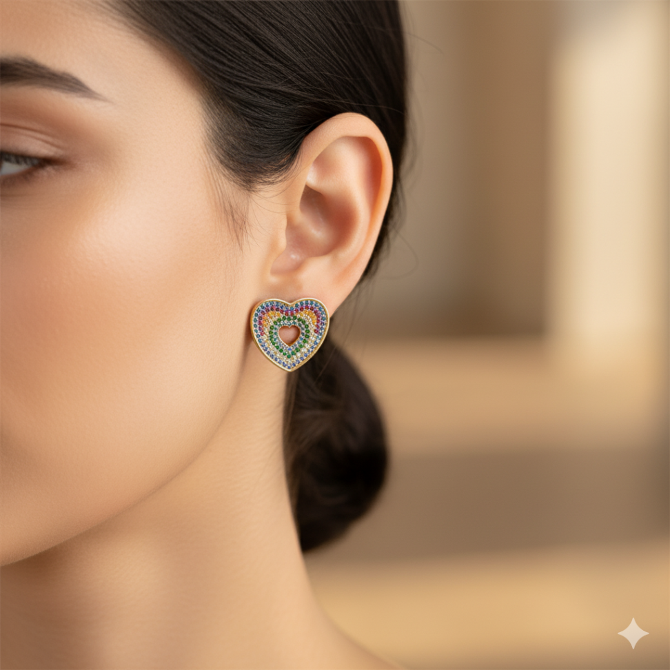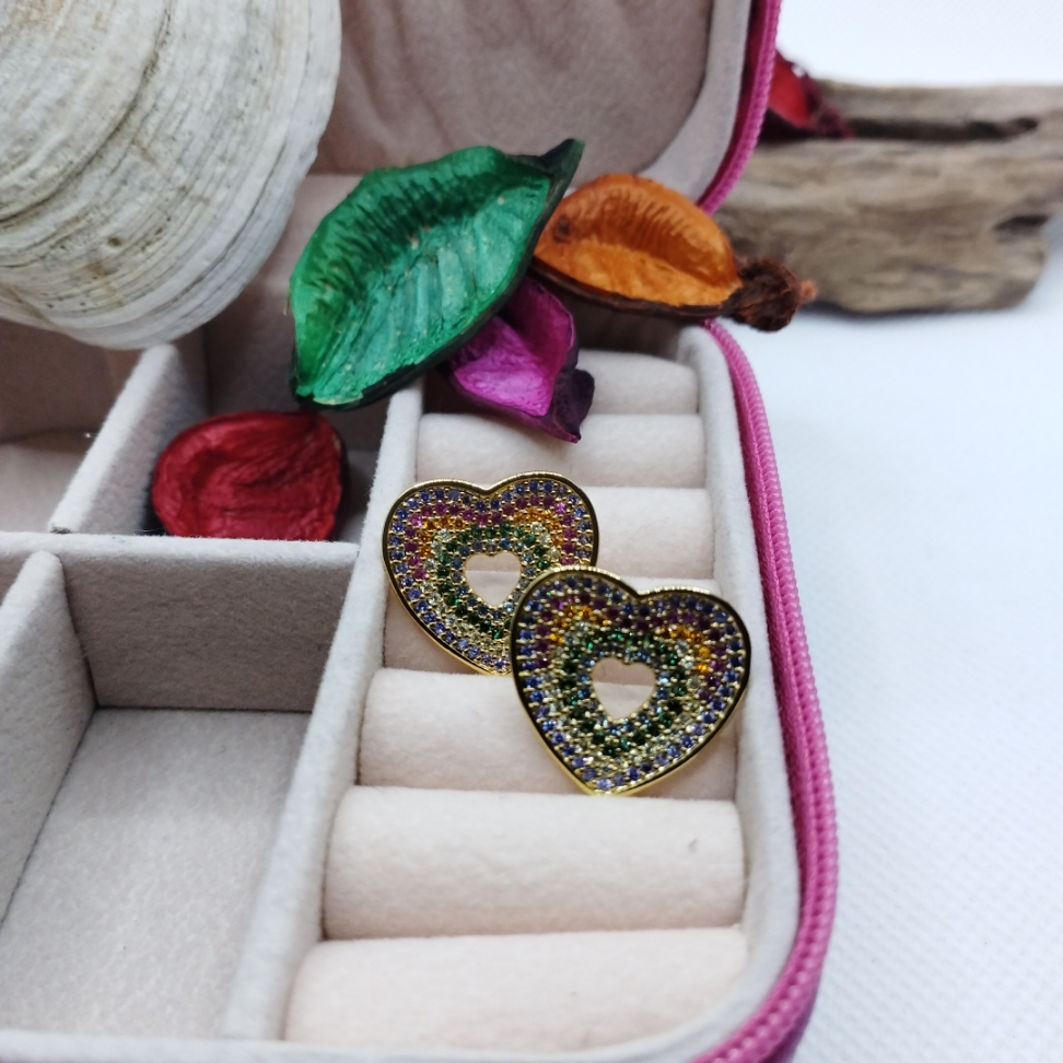 Brinco coração de lado cravejado de zircônias Pink